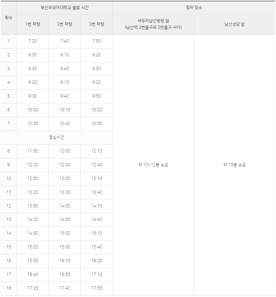 지하철1호선(노포) 다대포해수욕장 방향 승차 → 남산역에서 하차 후 3번과 5번 출구 사이 새우리남산병원 앞에서 셔틀버스 및 금정3(마을버스) 이용