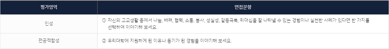 사전공개한 2개 문항에 대하여 면접관이 질문을 하게 되며, 이를 기반으로 인성, 전공적합성을 정성적·종합적으로 평가함.