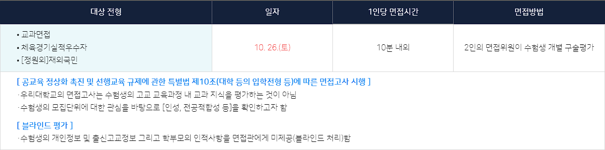 면접 당일 고사장 및 대기실은 수험생 및 면접고사 관계자만 출입이 가능합니다.(학부모, 지인 등은 출입불가)
