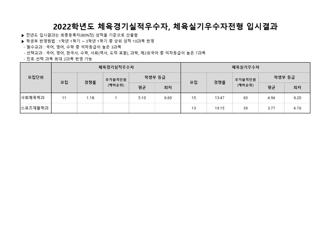 전년도 입시결과 수시 2022학년도 - 체육경기실적우수자, 체육실기우수자전형 첨부파일전년도 입시결과 체육실기_실적80.pdf(38.4K) 2022학년도 - 체육경기실적우수자, 체육실기우수자전형 2022. 4. 7조회수5,905 2022학년도 - 특성화고교과, …목록2022학년도 - 정원외(농어촌_…