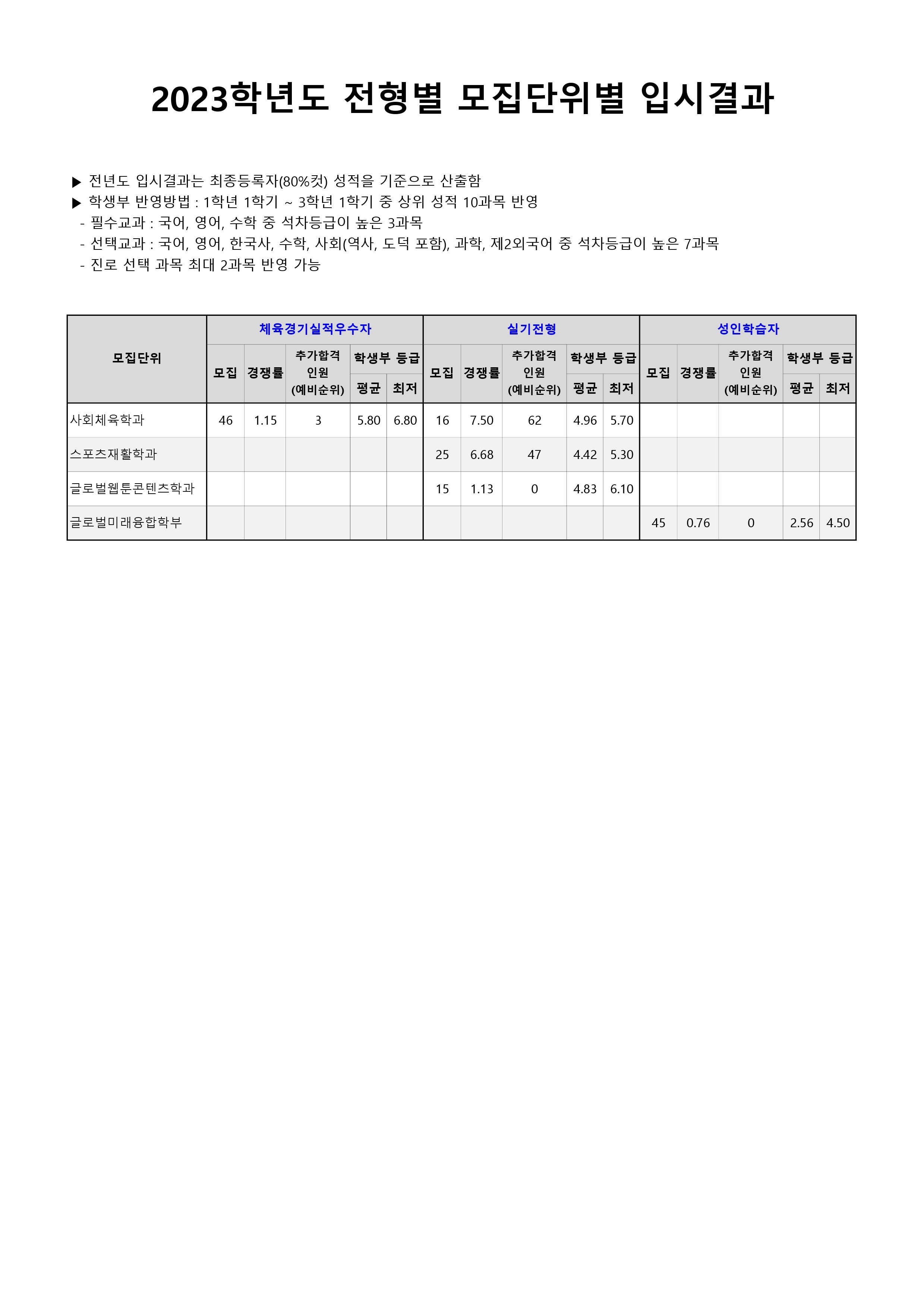 전년도 입시결과 수시 2023학년도 - 체육경기실적우수자, 실기전형, 성인학습자전형 첨부파일3. 2023학년도 입시결과 체육경기실적우수자_실기전형_성인학습자80.p…(344.1K) 2023학년도 - 체육경기실적우수자, 실기전형, 성인학습자전형 2023. 3. 28조회수5,084 2023학년도 - 특성화고교과, …목록2023학년도 - 정원외(농어촌,…