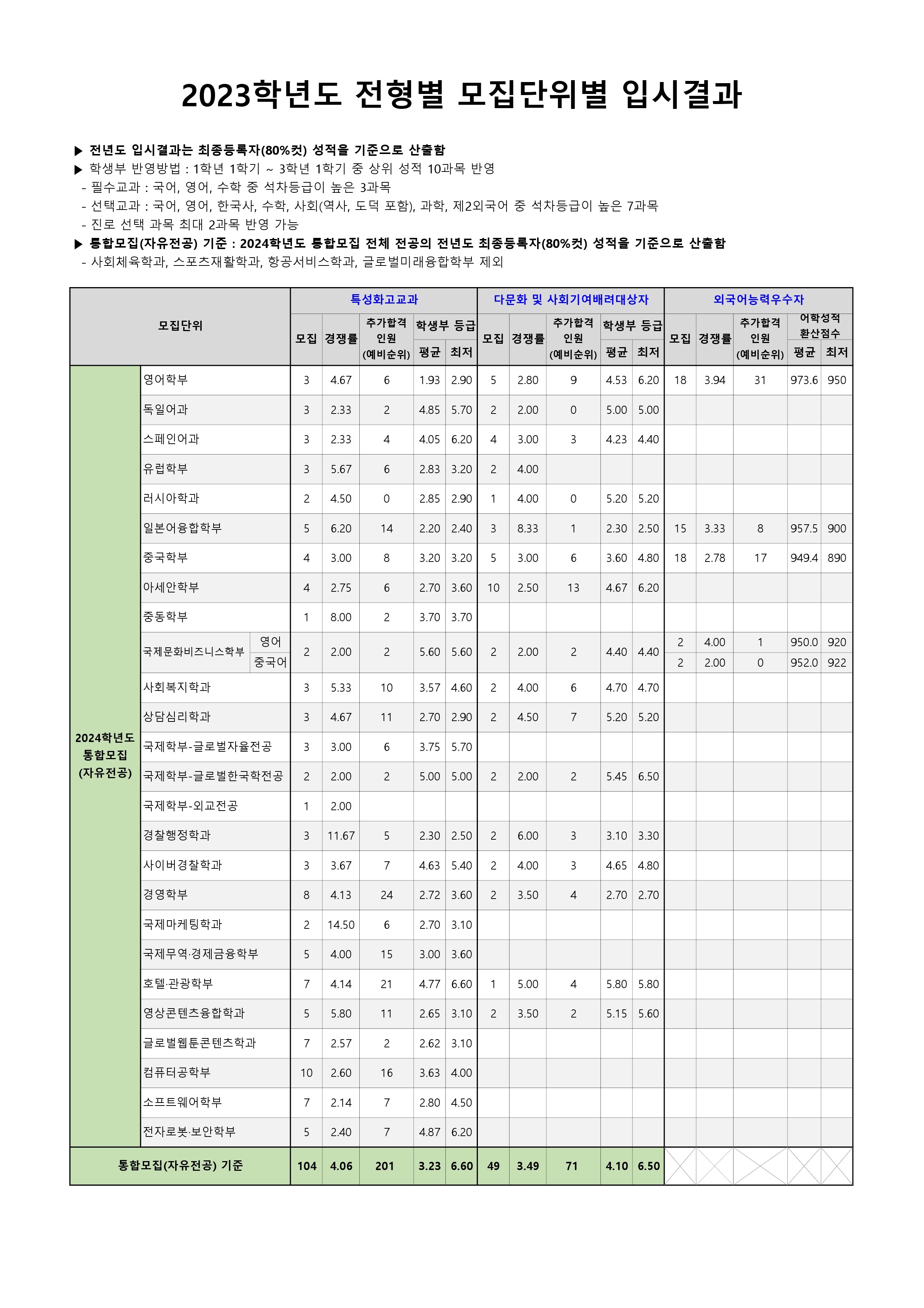 전년도 입시결과 수시 2023학년도 - 특성화고교과, 다문화 및 사회기여배려대상자, 외국어능력우수자전형 첨부파일2023학년도 입시결과 특성화_사배자_어학80.pdf(59.4K) 2023학년도 - 특성화고교과, 다문화 및 사회기여배려대상자, 외국어능력우수자전형 2023. 3. 28조회수8,578 2023학년도 - 일반고교과, 교…목록2023학년도 - 체육경기실적우수…