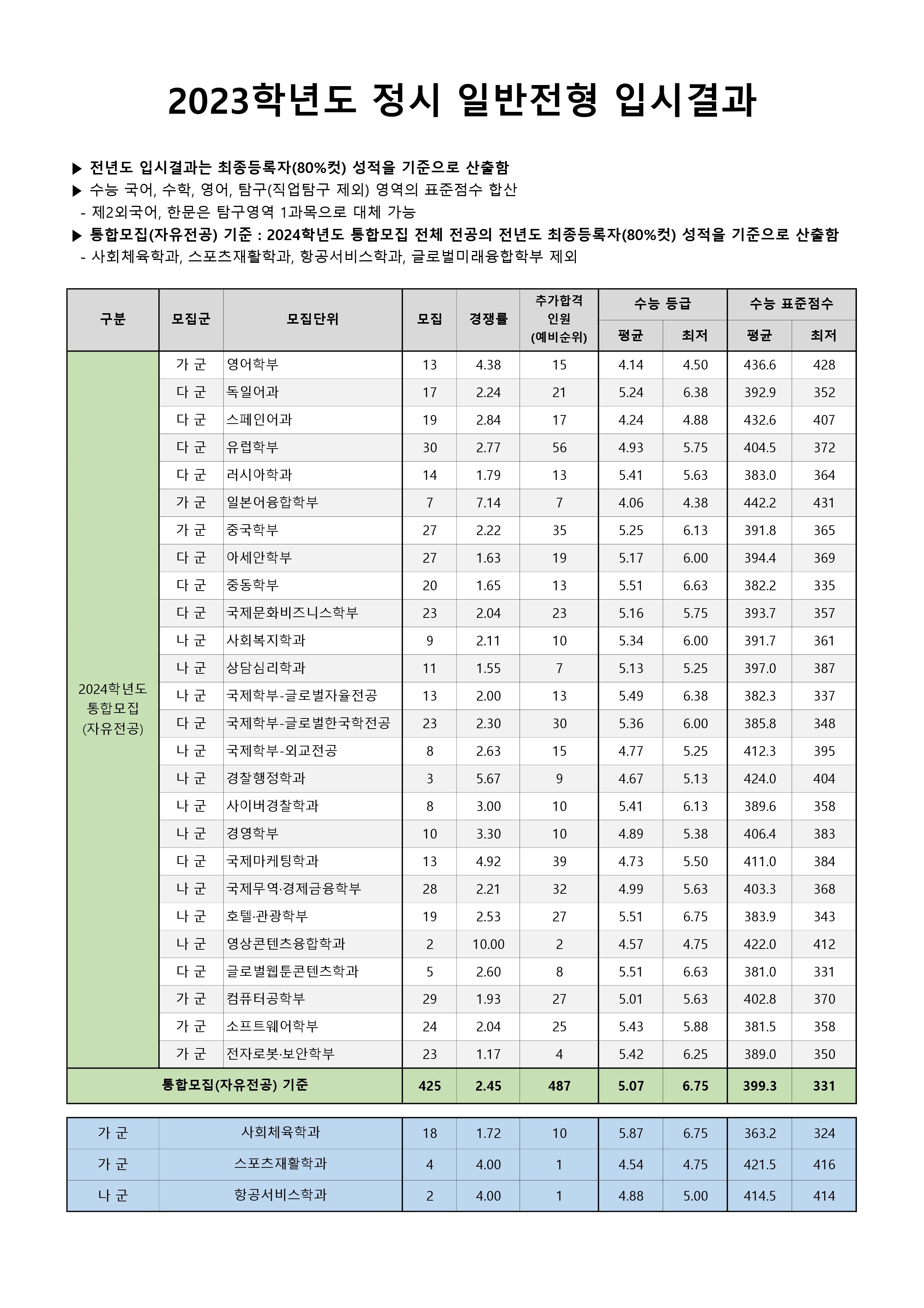 전년도 입시결과 정시 2023학년도 - 정시 일반전형 첨부파일5. 2023학년도 입시결과 정시 일반전형80.pdf(716.8K) 2023학년도 - 정시 일반전형 2023. 3. 28조회수10,927 [2023학년도] 편입학 지원자 …목록2023학년도 - 일반고교과, 교…