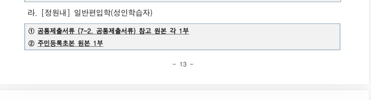 라. (정원내)일반편입학(성인학습자) 이부분은 일반 편입학 지원자도 서류 내는게 맞는거죠? 그 리고 여기도 1번에 "공통제출서류 (7-2, 공통제출서류) 참 고 원본 각 1부"라고 적혀있는데 위에랑 똑같이 공통제출 서류 제출하면 되는 걸까요?