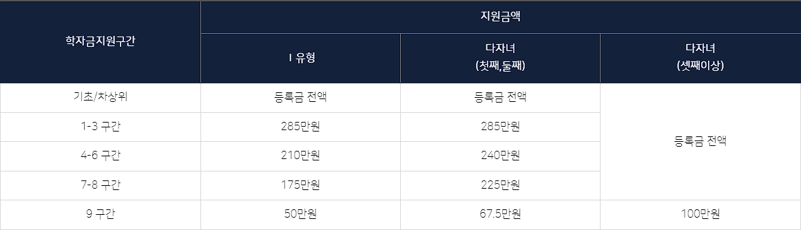국가장학금 소득분위별 지원금액(한학기 기준)